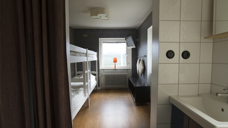 Bäck Standard fyrbäddsrum har två enkelsängar och en bäddsoffa som blir till en våningssäng, ligger på våning 1.