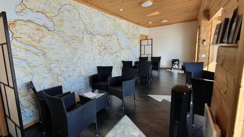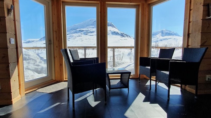 Här får hela familjen eller kompisgänget plats, och här kan kan man prata toppturer, värsta åket eller fiskeäventyr med helväggskartan som stöd – eller bara sitta med favoritdrycken i handen och njuta av hur kvällssolen bäddar in Vassitjokka i sitt vackra ljus.